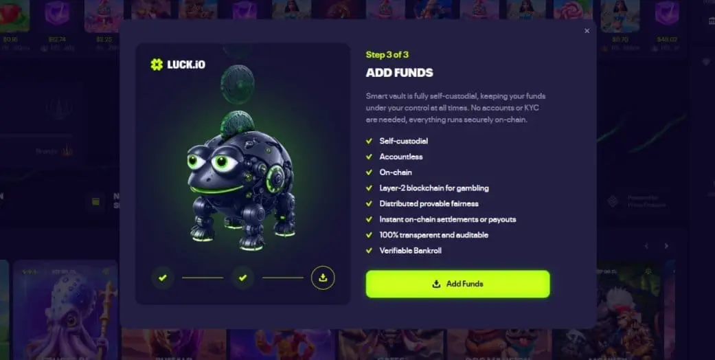 Luck.io never takes custody of your funds — instead, you remain in control of them via smart contracts, with your funds temporarily placed into a non-custodial smart vault.