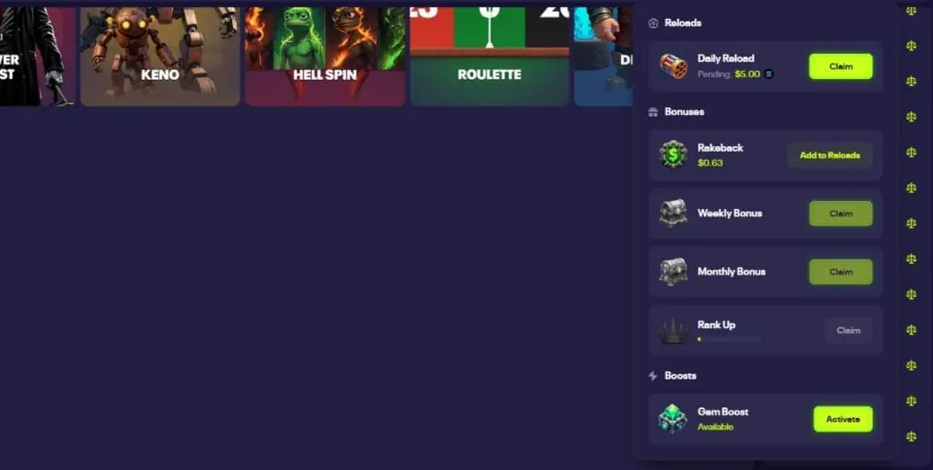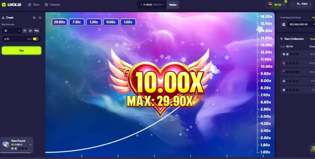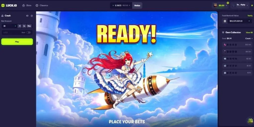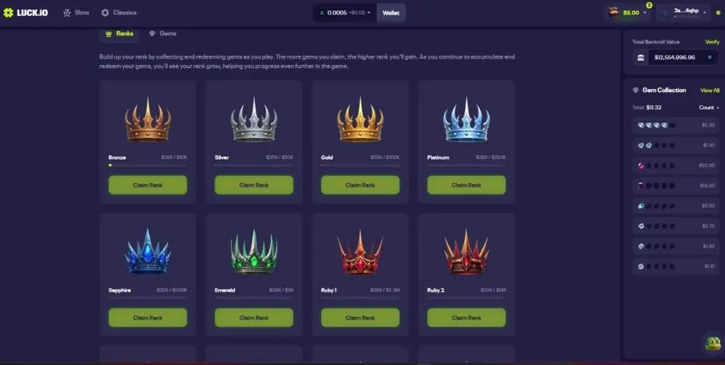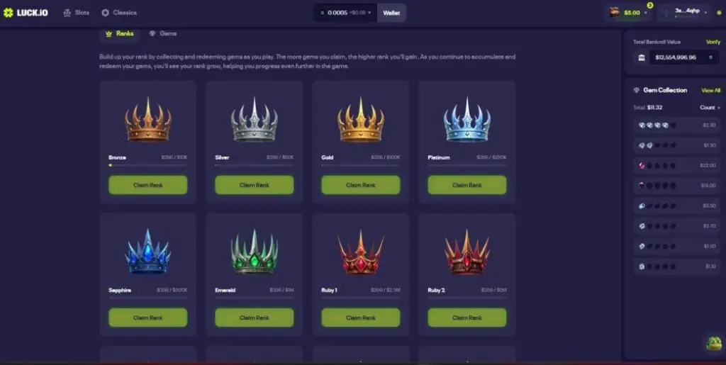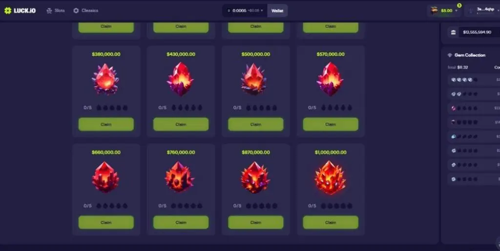 Players at Luck.io can claim various ongoing bonuses and rewards. This includes an off-chain “gems” rewards system, which involves collecting gems that can be exchanged for cash prizes.