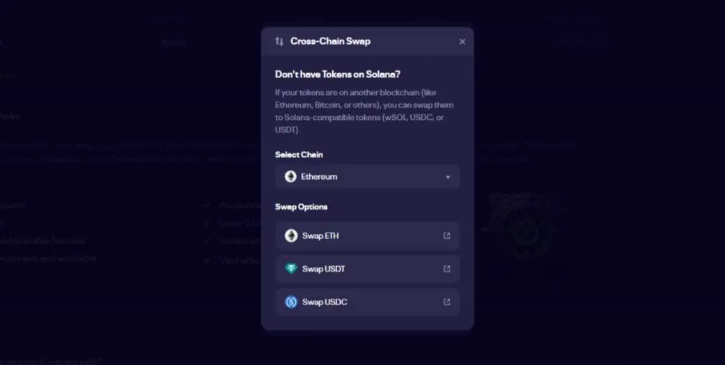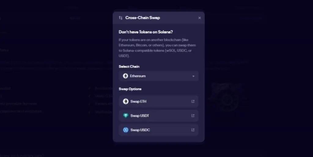 There’s also a Cross-Chain Swap facility, allowing you to swap tokens on other blockchains (Ethereum, Bitcoin, etc.) to Solana-compatible tokens.