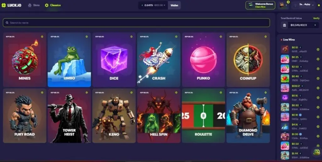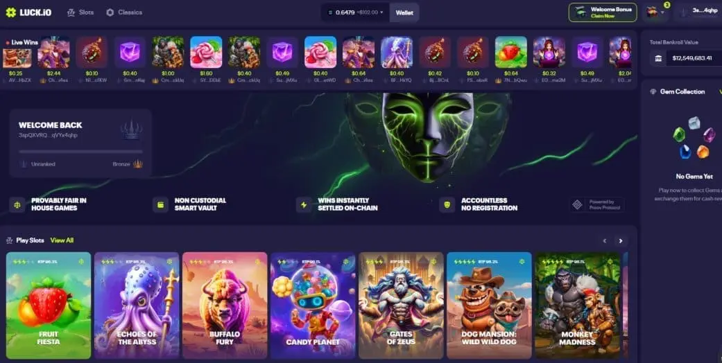 Described as a “trust-free degen paradise” by DappRadar, Luck.io is a ‘decentralized’ casino utilizing the Solana blockchain, reportedly from the team behind Rollbit. It shouldn’t be confused with the similarly named Luck.com — a totally different casino. Luck.io launched in early 2025, and at the time of writing the platform offered nearly 70 slots and 12 classic games — all “original” and provably fair via Proov.network.