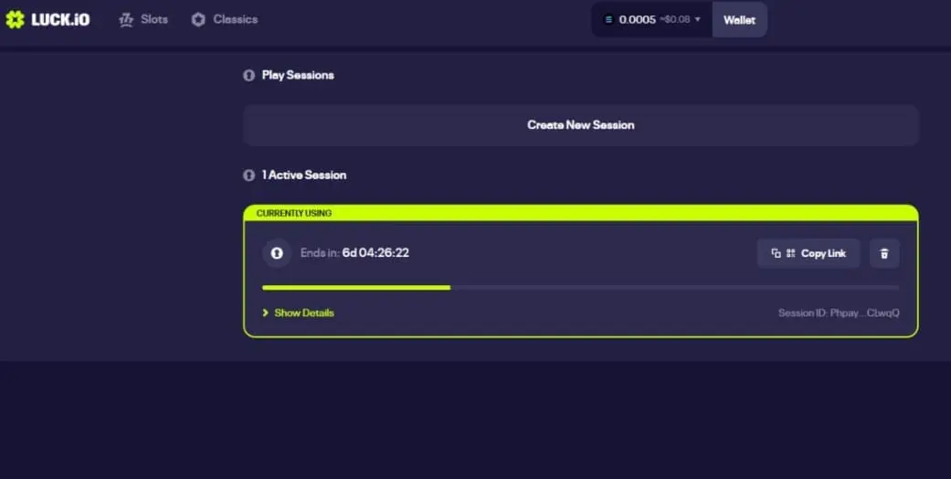 Also, Luck.io enables you to share a play session. This means you can play on your smartphone or other device without the need to install your Solflare or Phantom wallet on it. Sharing a play session does not grant access to withdraw funds, but does allow you to wager and play within set constraints. To share a play session with another device, simply navigate to “Play Sessions”, then tap “Copy Link.”