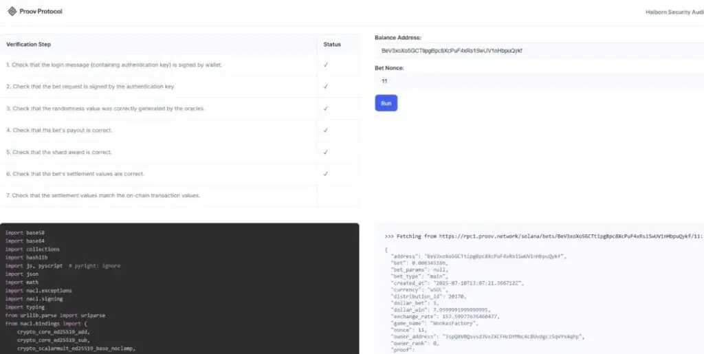 Verifying the results of rounds is also extremely easy here compared to many casinos. You can easily set a new custom seed, then check the results on Proov.network after playing. Simply click the small scales symbol next to the information, sounds, and settings tabs. To verify your results, you just need to enter the Bet Nonce (the number of the round from this gaming session). Your Balance Address will be automatically entered. By default, a play session lasts 7 days, but you can create a new session at any time from your account menu.