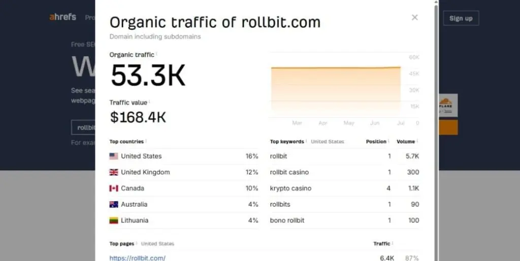 And, judging by the streamers promoting the platform and Ahrefs traffic data (yes, I know the real traffic is likely much higher, but it gives a good idea of where it comes from), the USA, UK, and Australia are three of the most important markets for Rollbit.