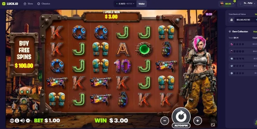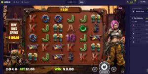 Next up, I tried Wasteland Wonders – a post-apocalyptic slot that looks like Mad Max Fury Road had a baby with Cyberpunk 2077. Again, visually its impressive – with slick background graphics and animations – and again it packs an avalanche feature, giving the possibility of multiple consecutive wins. The maximum win is also the same at 5,000x your bet.