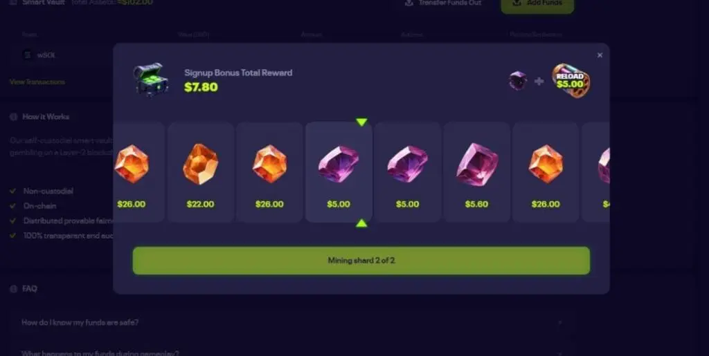 At the time of writing, the Luck.io welcome bonus was worth up to US$1,000. When you claim the bonus, you’ll get to “mine 2 shards”, resulting in gems worth a certain amount – which forms your bonus.