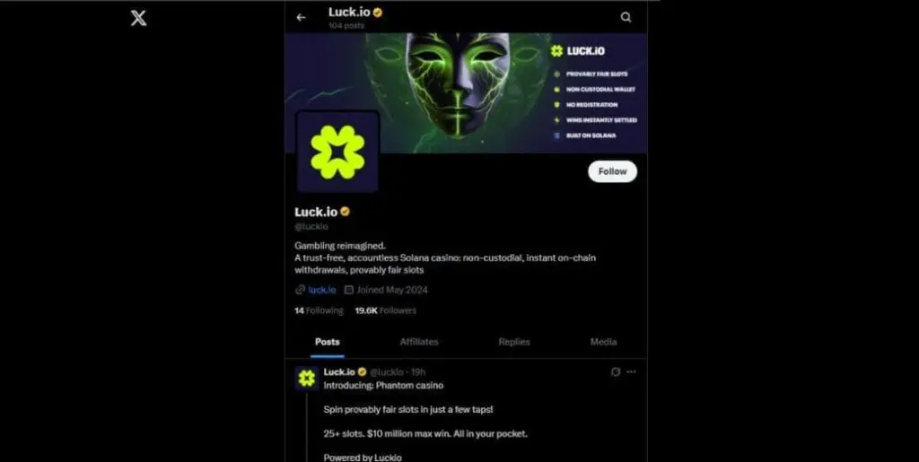 You can also follow and connect with Luck.io casino on X (Twitter).
