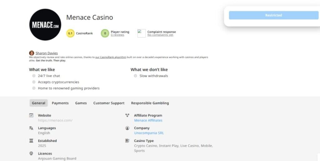 Right, so that’s what Menace.com casino offers, but what kind of reputation does it have? Well, as always, you should take most ratings with a pinch of salt. Trustpilot has been flooded with fake reviews and the rest are mostly from casino affiliates. And in this case, the casino is so new that it doesn’t have many ratings yet.