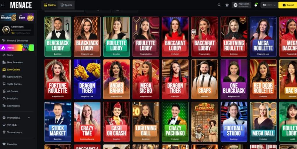 The Menace live casino is well stocked with live dealer games from Evolution, Pragmatic Live, Live88, Ezugi, Asia Gaming, Vivo Gaming, and MG Live. You’ll find all the usual live blackjack, roulette, baccarat, and poker variants, along with dice games like craps and sic bo.