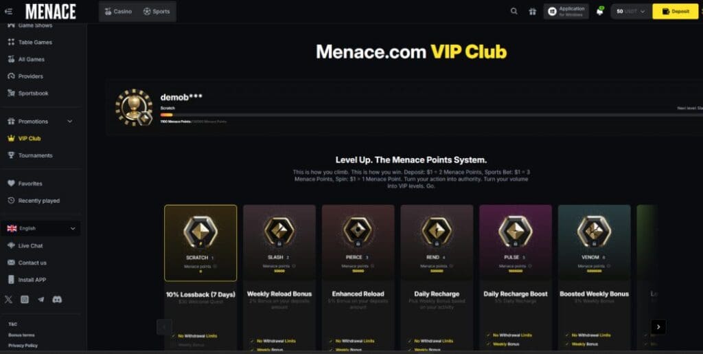 The Menace.com VIP Club is a 14-tier points based program. You earn 2 Menace Points for every $1 you deposit, plus 3 from every $1 bet on sports, and 1 for every $1 you spin at the casino.