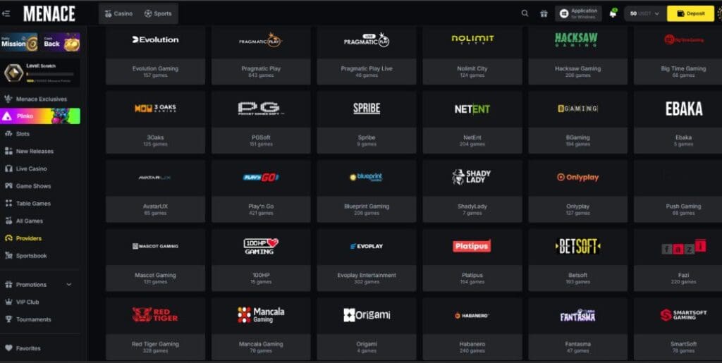 At the time of creating this Menace casino review, the platform offered around 8,250 casino games from over 50 providers (despite some reviews claiming it offers 10,000+). Generally speaking, things are neatly presented, but more categories and filters would make browsing easier.