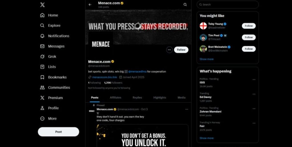 Launched in 2025 by “founders featured in Forbes,” Menace.com comes out swinging with over 8,000 casino games, plus full sports and esports betting. It even kicks things off with a 7-day, 10% lossback welcome deal that’s refreshingly wager-free.