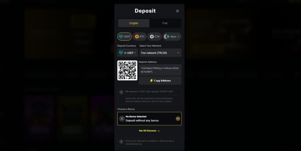 To make a crypto deposit, tap the yellow “Deposit” tab, sel;ect “Crypto”, then choose your cryptocurrency and network. You’ll be provided with a unique deposit address in both QR code and text formats. The minimum deposit for the specific crypto will be stated. At this point, you can also select from available bonuses.