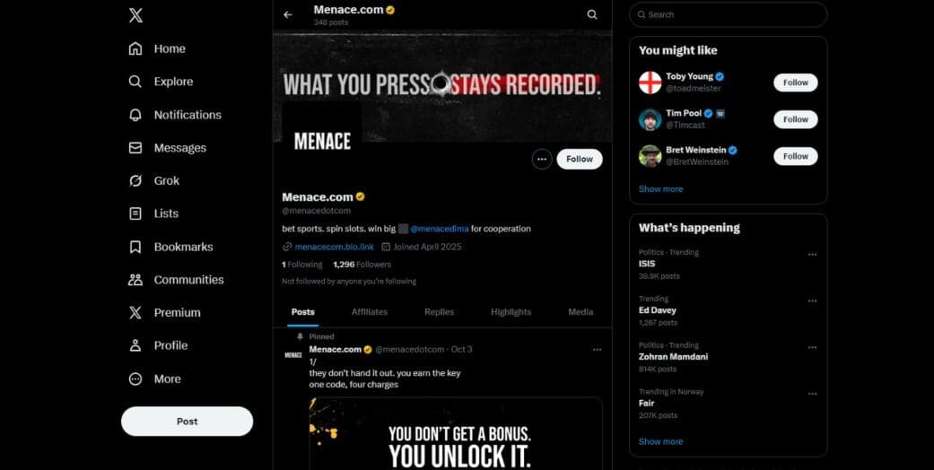 Menace is owned and operated by UNOCOMPAÑIA S.R.L., a company registered in Costa Rica (company no. 3-102-927059). It is operating under an Anjouan license (ALSI-202506021-FI1).