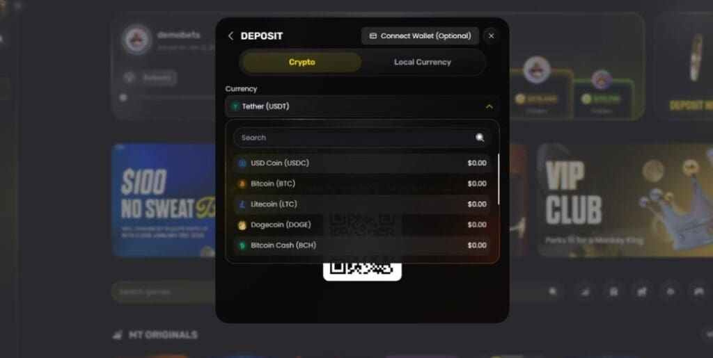 Monkey Tilt also supports fiat options in selected local currencies.