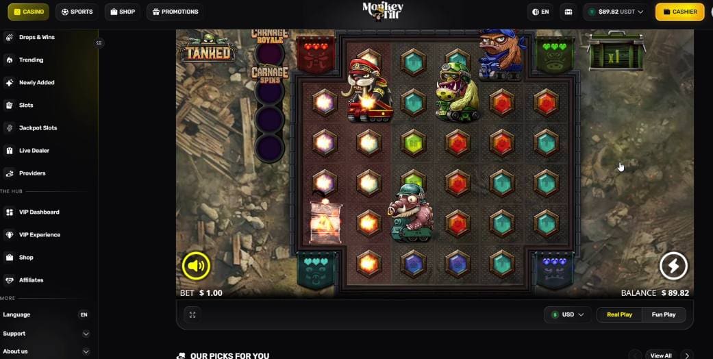 I got things started at Monkey Tilt with Tanked from Nolimit City. I’ve played this before and it was a blast – literally. As you’d expect from this provider, things are mental. There’s so much going on, it’s tough to keep “track” of things.
