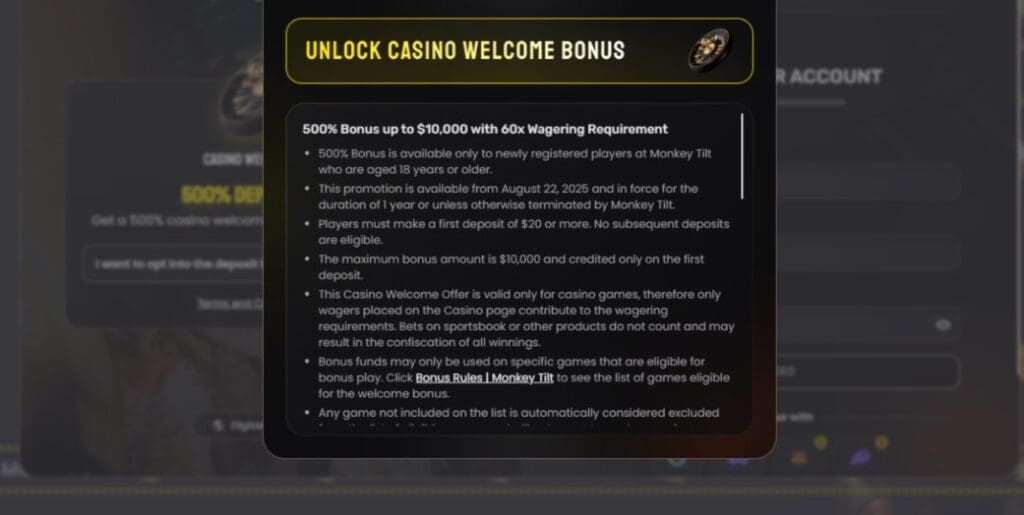 At the time of writing this MonkeyTilt review, the casino was offering a welcome bonus of 500% up to $10,000. And, on the surface at least, that sounds pretty good. But is it? Let’s look under the hood.