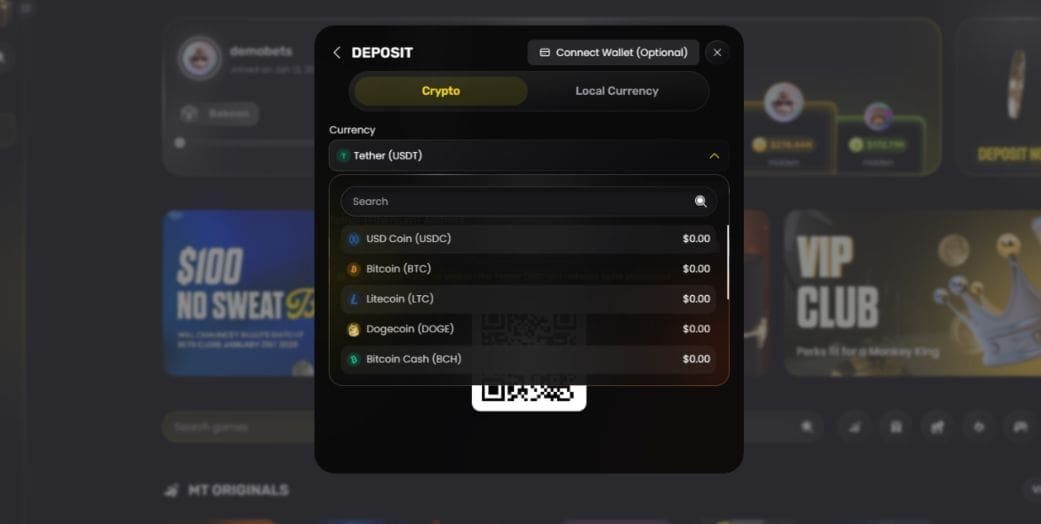 To make a crypto deposit, navigate to “Cashier”, then tap “Deposit”, then “Crypto” and choose your desired currency from the drop-down list. You’ll be provided with a unique deposit address in text and QR code formats. Alternatively, you can connect a supported crypto wallet.
