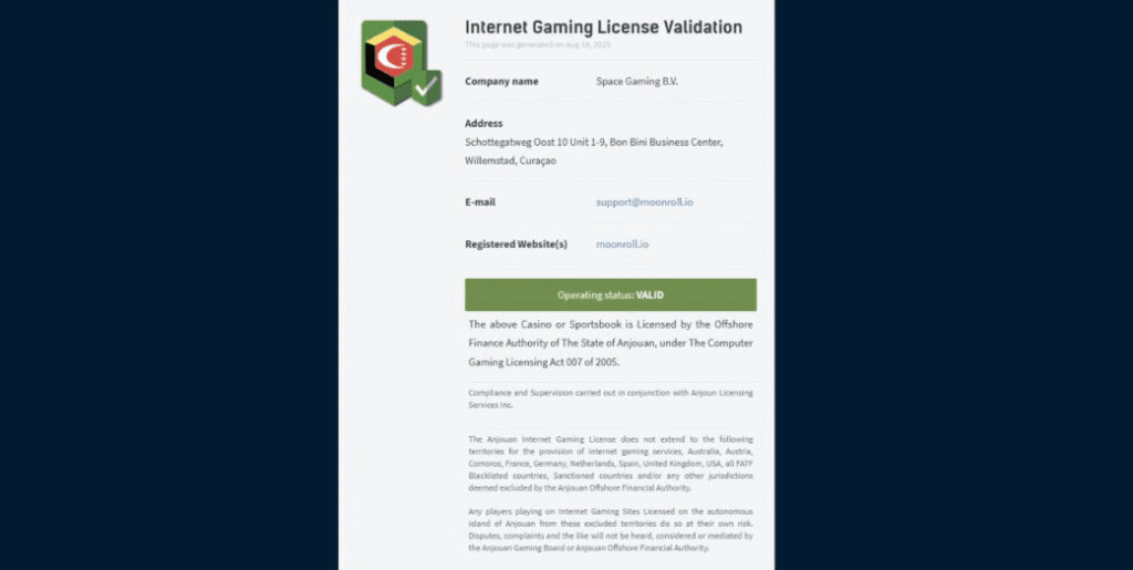 Moonrooll.io is owned and operated by Space Gaming B.V., based in Curaçao. Despite this, it is operating under an Anjouan license.