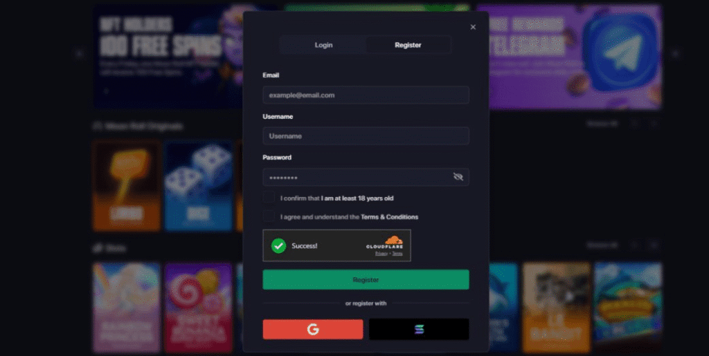 At least getting up and running with Moon Roll crypto casino is quick and easy, with a few sign up options available: