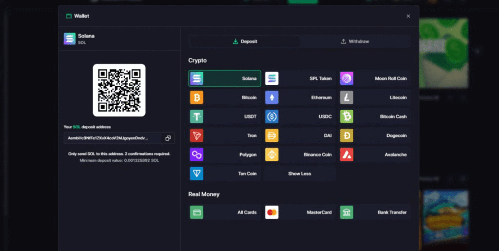 Moonroll also supports fiat options including Mastercard and bank transfer.