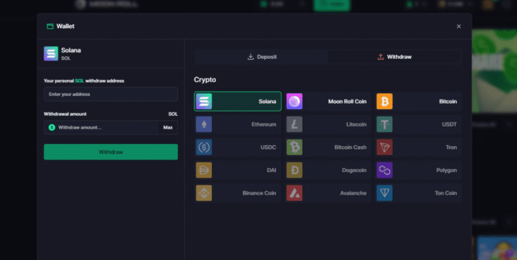 Moonroll.io supports a reasonable range of cryptos withdrawals – although memecoin users may be disappointed.