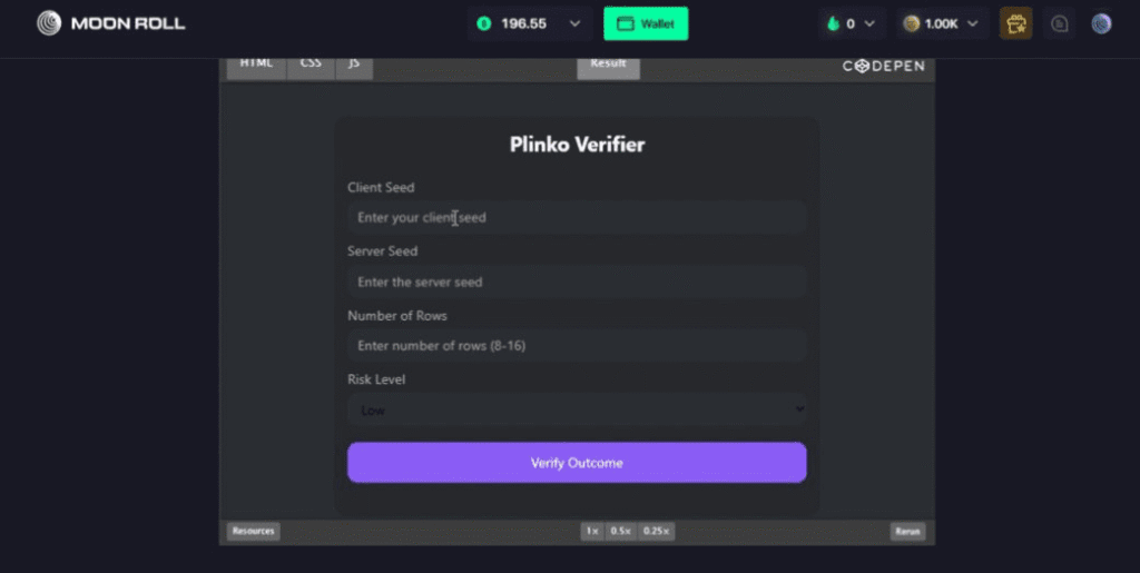 Moonroll.io casino offered a very small range of what it claims to be provably fair original games, namely: Limbo, Dice, Mines, Plinko, and Lootboxes. However, there’s a big red flag that suggests things might not be as fair as the casino wants you to think. Specifically, you can’t see the seeds until after your game has finished.