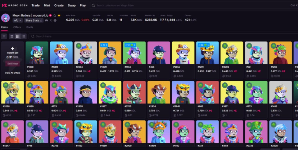 Moon Roll casino also has a range of 4,444 Solana-based NFTs (non-fungible tokens) called “Moon Rollers.” You can buy and trade them at the Magic Eden marketplace, and at the time of reviewing, the floor price was standing at 0.395 SOL. There was some activity, with 11 sales over the previous 24 hours, while the market cap stood at $288.9K and there were a total of 421 Moon Roller NFT holders.