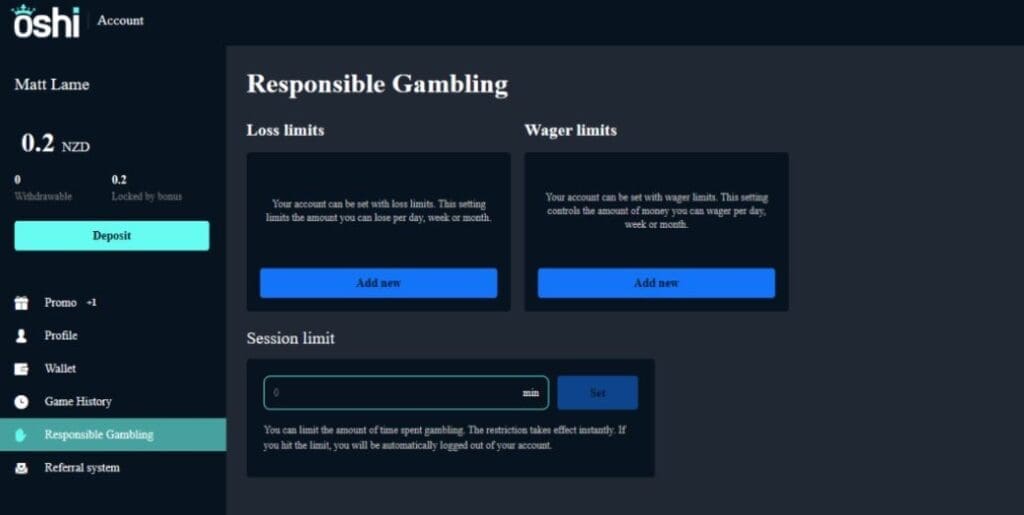 One of the strongest points for Oshi is that all terms and conditions (once you’ve logged in) are easy to find and clearly written. Easy to use responsible gambling tools are also provided, allowing you to set loss limits, wager limits, and session limits without needing to contact support. This is great to see – but then again, all Curacao-licensed online casinos will soon be required to do this.