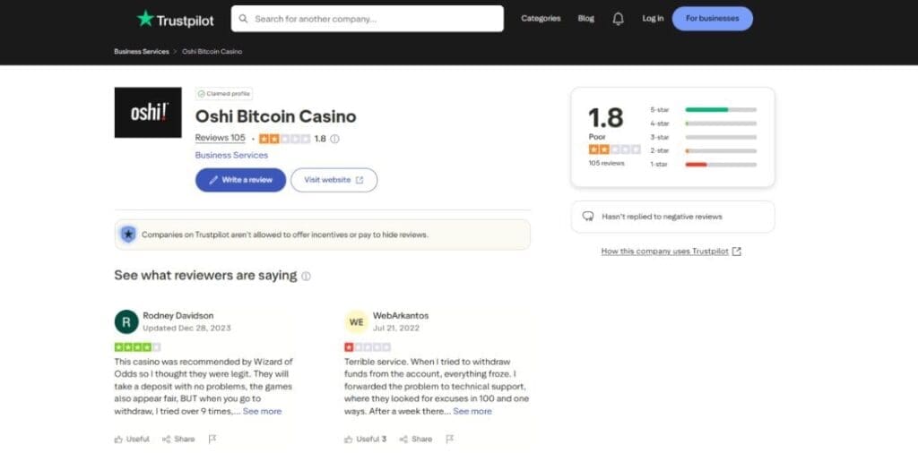 As you can see, the ratings are mixed. Trustpilot’s score is exceptionally low, but Casino Guru and AskGamblers give it glowing reviews. Of course, you need to keep in mind that the latter two are both iGaming affiliates, with financial incentives to promote casinos, including Oshi.