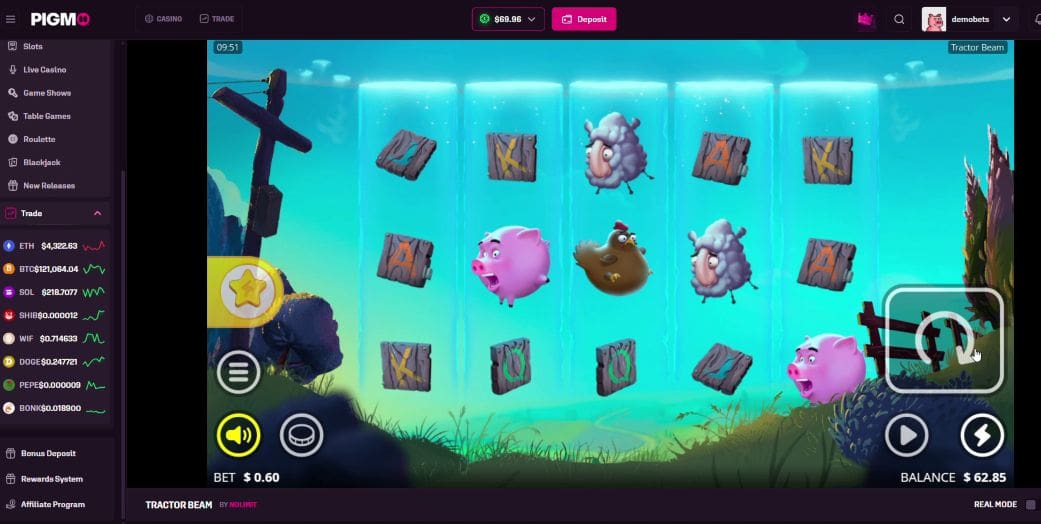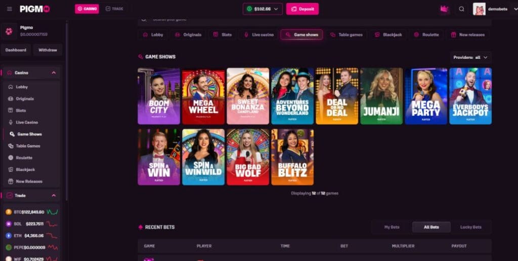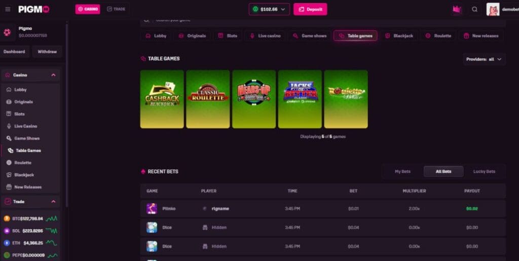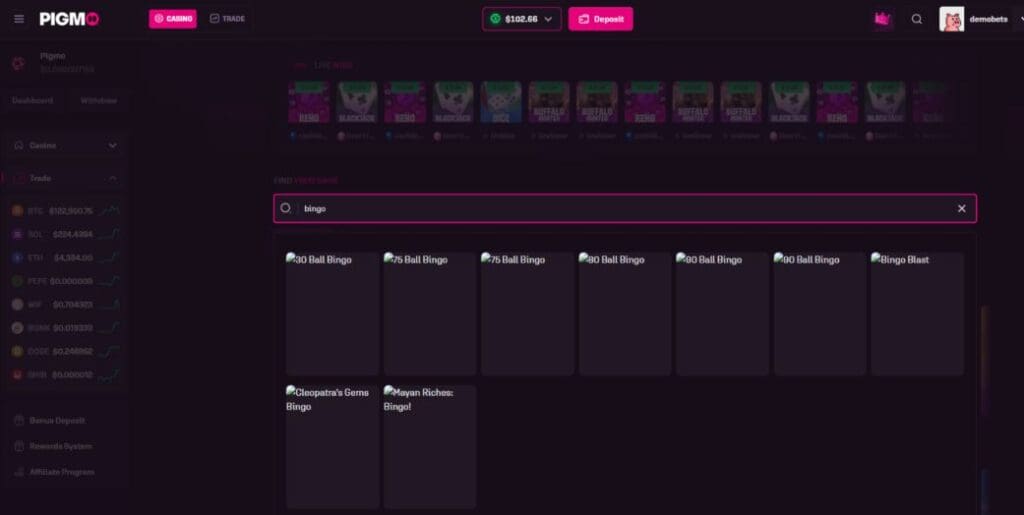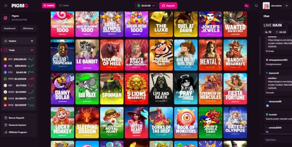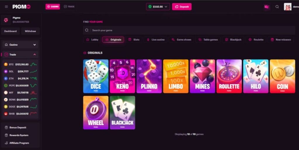 Pigmo has been rolling in the mud since 2023, but its games catalog is still limited and the bonus system is strange – but it does have crypto trading.