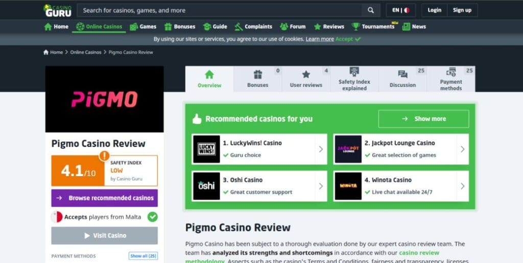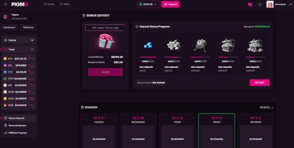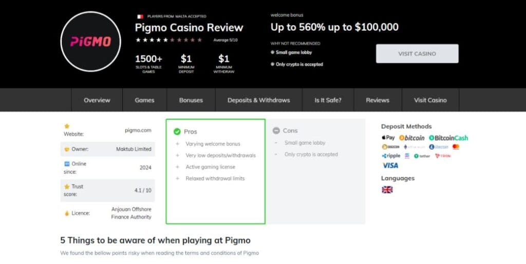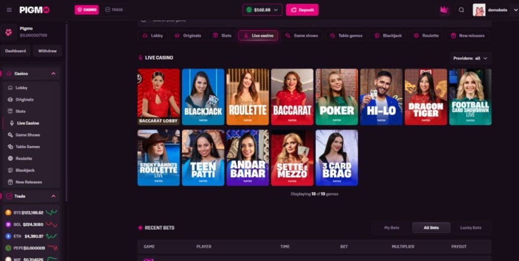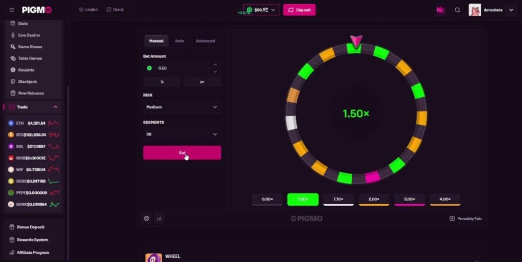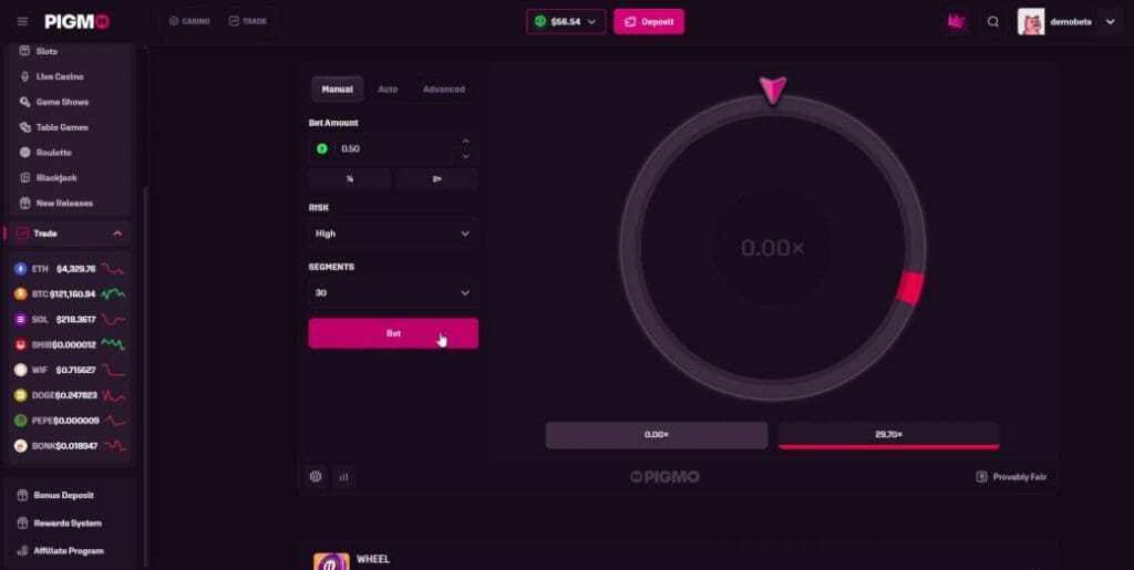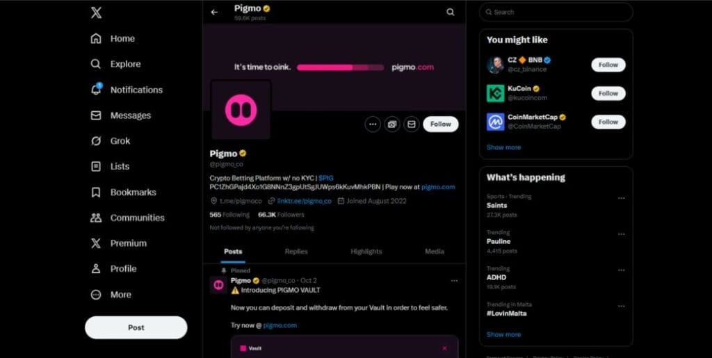 Pigmo has been rolling in the mud since 2023, but its games catalog is still limited and the bonus system is strange – but it does have crypto trading.