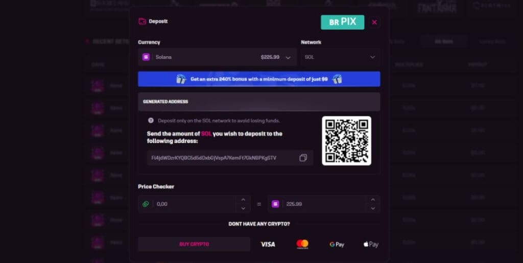 Like all the best crypto casinos, Pigmo.com enables you to purchase crypto directly using fiat methods like Visa, Mastercard, G Pay, and Apple Pay via a third-party integration. At the time of writing this Pigmo review, the only provider available appeared to be PIX. You’ll find the “Buy Crypto” option by tapping “Deposit.”