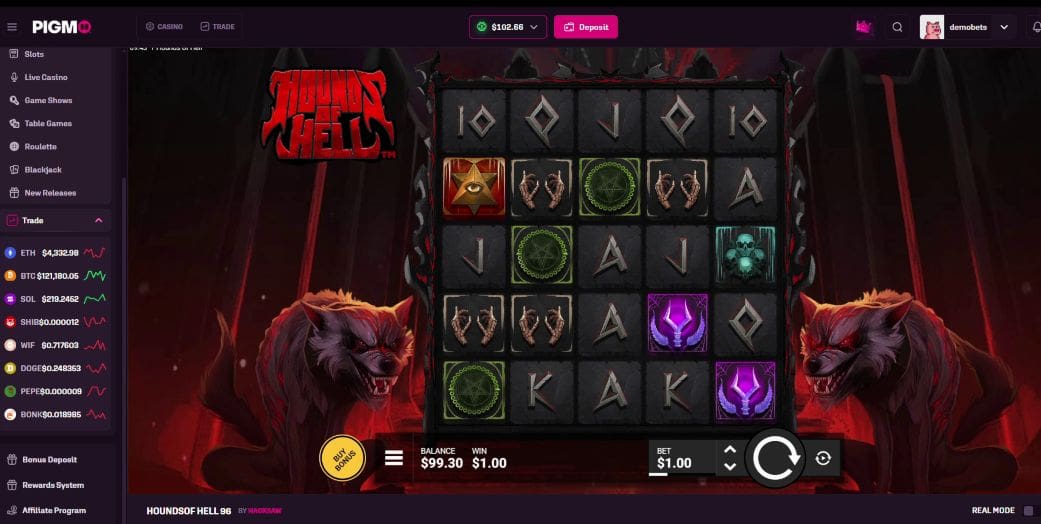 Okay, I’ll admit it, I chose to start with Hounds of Hell from Hacksaw, because I was visualizing the beasts chasing the stupid Pigmo pig. Really, the casino had already wound me up that much before I’d even started playing.