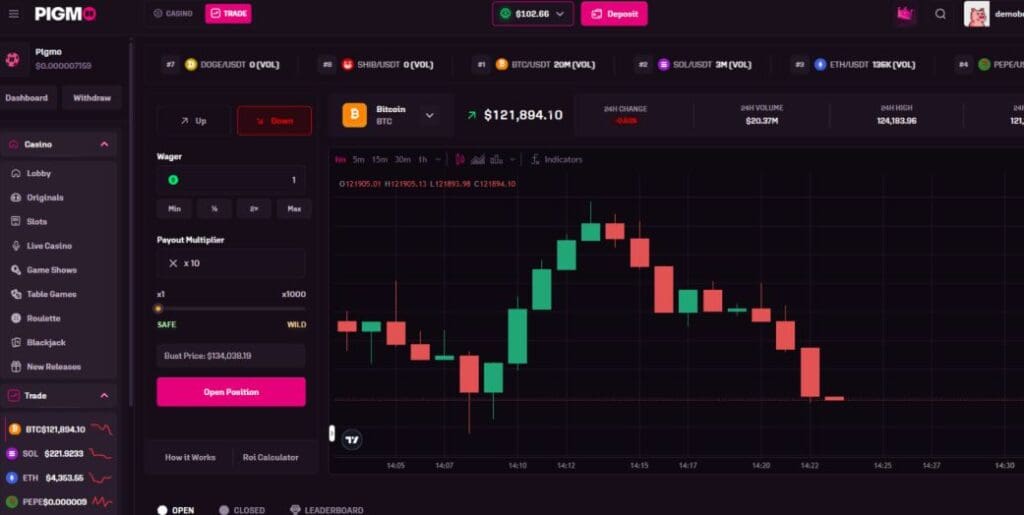 Pigmo.com also offers crypto futures trading. It’s simple binary trading – pick your crypto, then just bet on whether it’s going to go up or down. You can set a payout multiplier all the way from x1 to x1000. It’s fun, but don’t get fooled by the corporate style visuals and terms like “Roi Calculator” – this is not investing, it is gambling.