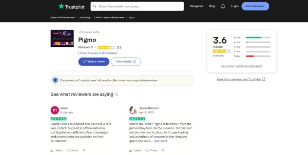 So that’s what Pigmo casino offers, at least at the time of writing, but what are other people saying about it? Well, as always, remember Trustpilot has been ruined by fake reviews and most platforms are run by “less than objective” affiliate marketers. But, for entertainment if nothing else, here are some ratings: