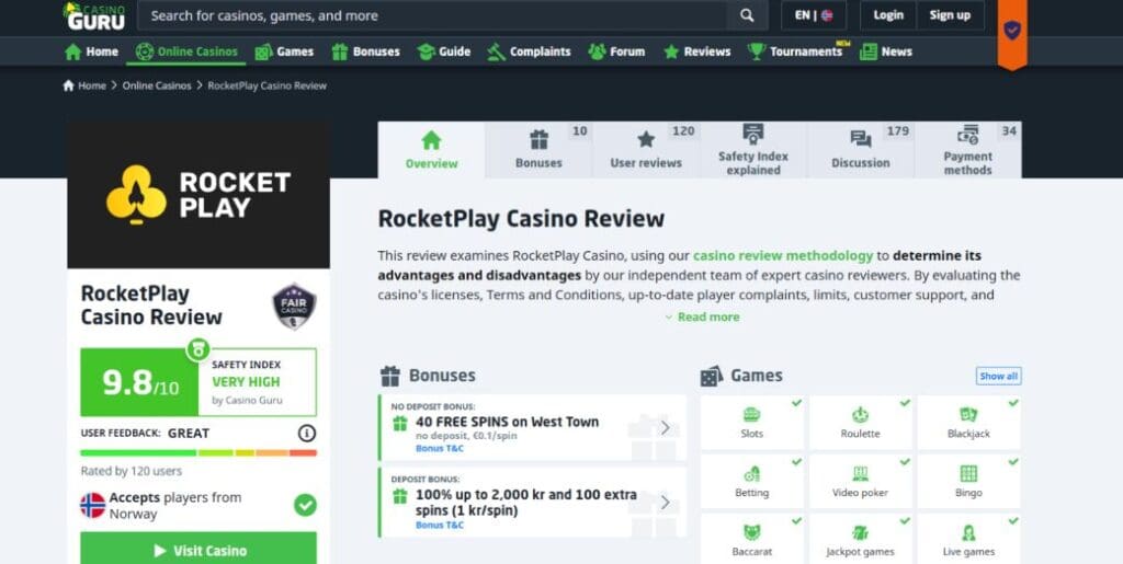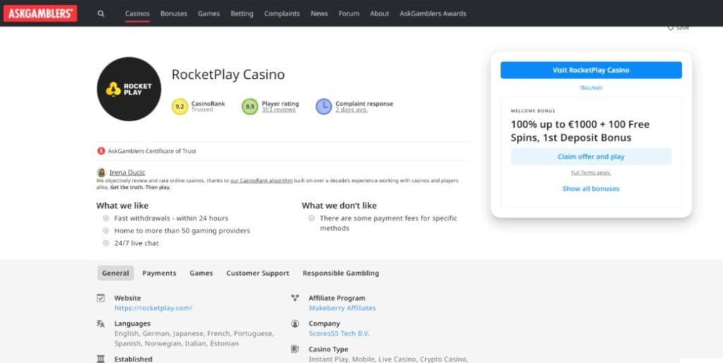 But out of interest, here are some ratings at the time of making this RocketPlay casino review:
