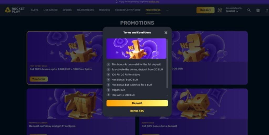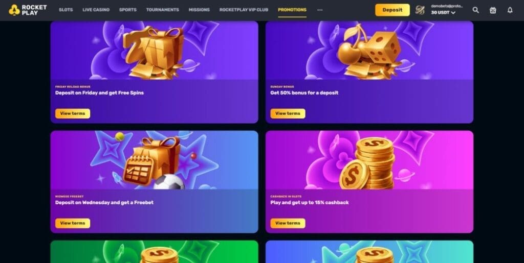 Complementing the Rocket Play casino welcome bonus are a bunch of other promos for existing players. At the time of writing this review, they included: