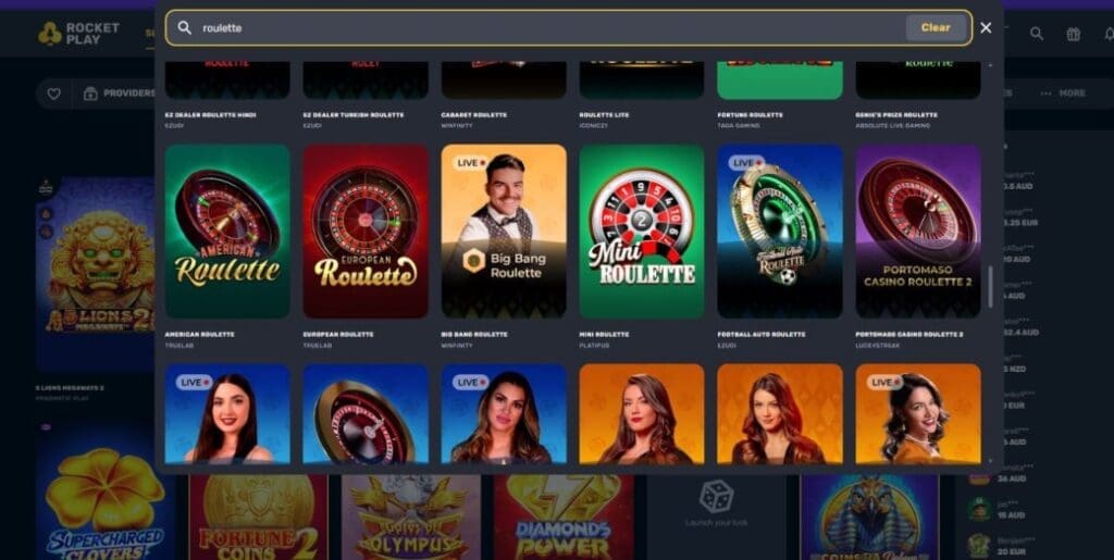 As usual, slots make up the vast bulk of this crypto casino’s games catalog. At the time of writing, the most popular slots at Rocket Play casino included Elvis Frog in Vegas from BGaming, Buffalo Space Grandways from Gamebeat, and Gold Nugget Rush – Hold & Win from BetSoft. Of course, Pragmatic Play slots like Gates of Olympus Super Scatter and Sugar Rush 1000 were also up there.