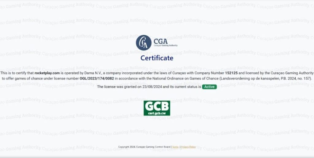 RocketPlay is operated by Dama N.V. – a Curaçao-based company (reg. no. 52125). It is licensed by the Curaçao Gaming Authority (OGL/2023/174/0082).
