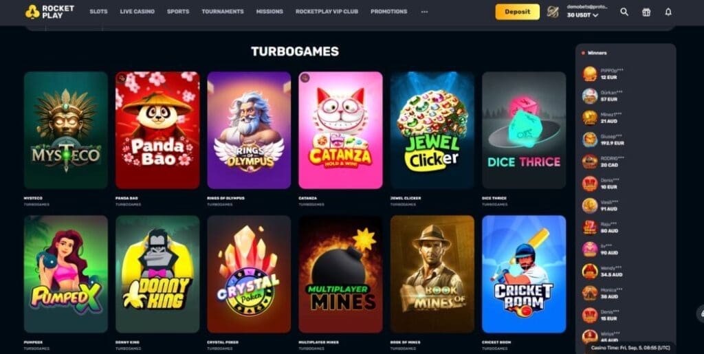 In addition to the crash titles already mentioned, provably fair game options at RocketPlay.com include Trader and Balloon from Spribe, Panda Bao and Dice Thrice from Turbo Games, and Twist and Coin Flip from InOut.