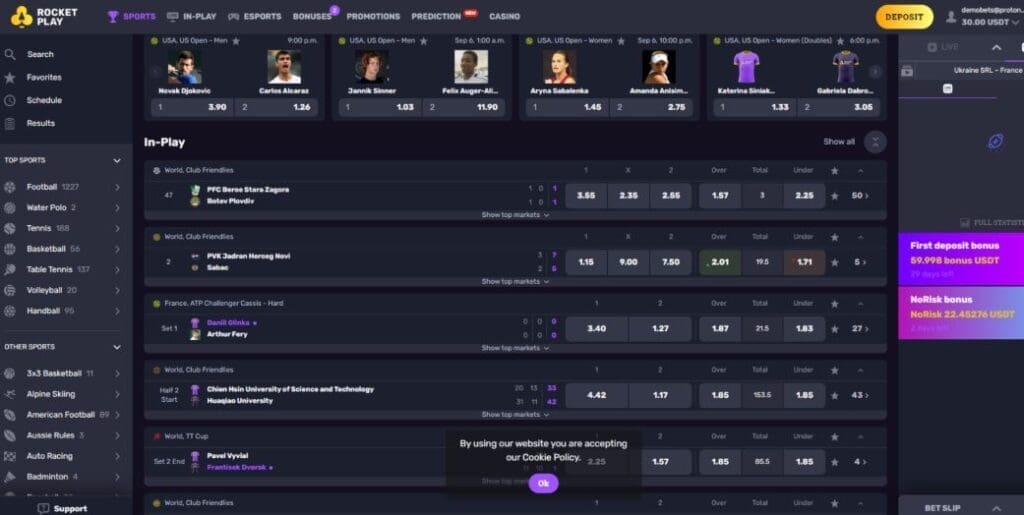 In common with the best crypto gambling platforms, Rocket Play also boasts a sportsbook. It offers a vast range of standard and live sports betting – on everything from football and water polo, to tennis and basketball. Additionally, esports betting is available on disciplines including Counter-Strike 2, Dota 2, eCricket, King of Glory, and League of Legends.