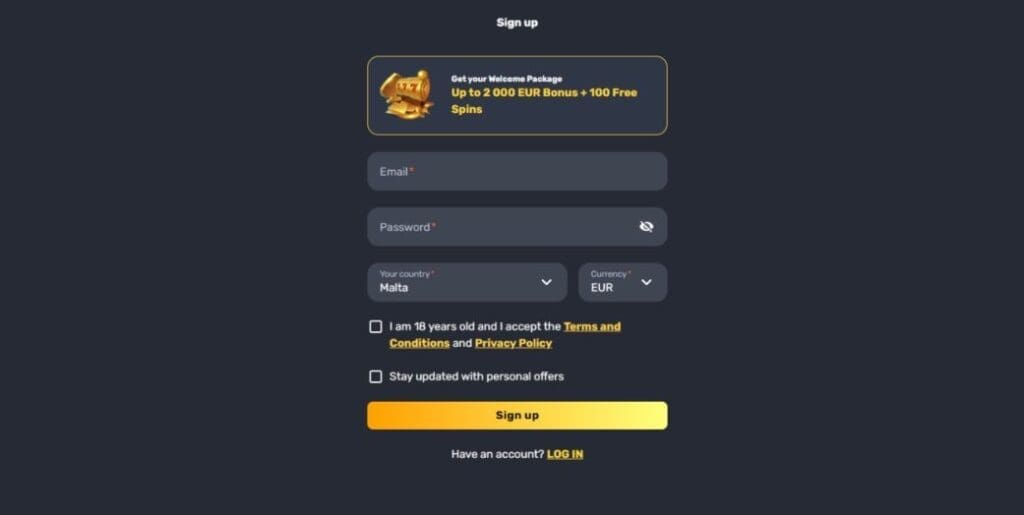 Tap “Sign up”, enter your email, set a strong password, select your country and currency, then confirm you’re 18+ and accept the Terms and Conditions and Privacy Policy. Finally, set your marketing preference and tap “Sign up”.