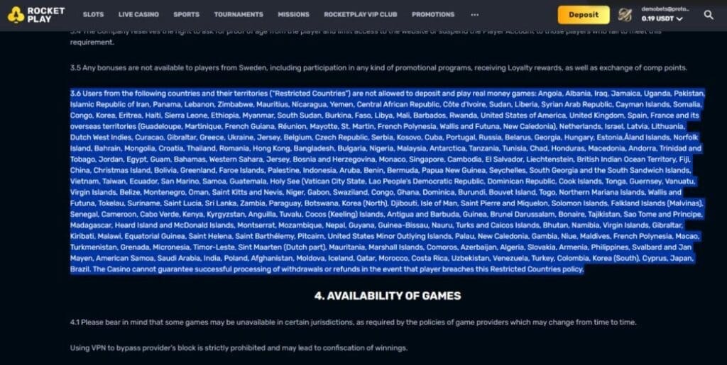 Important: Although no KYC is required when opening an account, you will be required to provide official ID before making your first withdrawal (from late 2025, all Curacao-licensed casinos are required to). As per the license requirements, RocketPlay casino specifically prohibits players from numerous jurisdictions, including the US and UK. If you play using a VPN from a banned location, you probably won’t be able to withdraw.