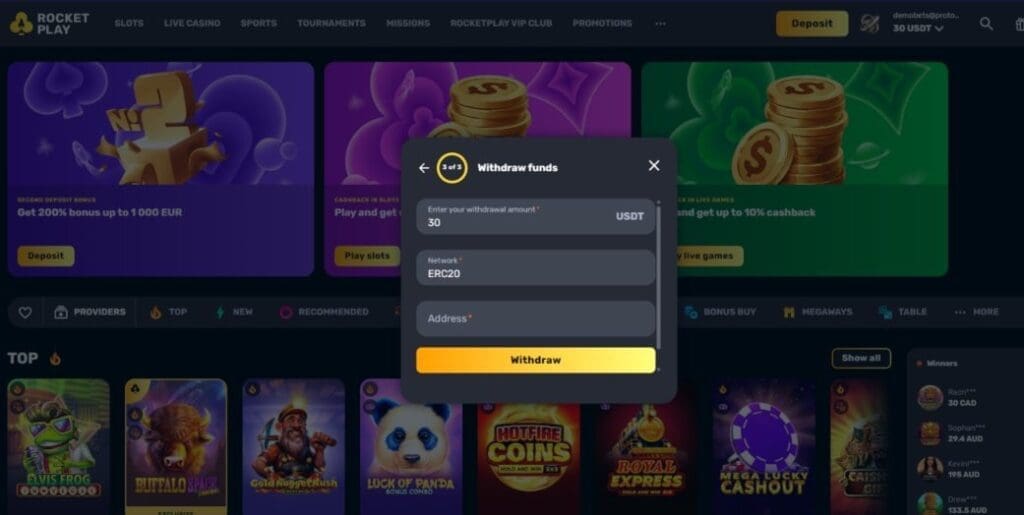 Rocket Play casino supports a limited range of major cryptocurrencies, but if you’re looking for a casino that accepts memecoins and privacy coins, this isn’t the place. Also, I have to say, RocketPlay has one of the clunkiest wallet/cashiers I’ve ever seen at a crypto casino.