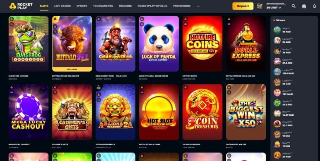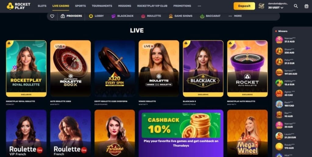 At the time of writing this RocketPlay review, the platform offered over 6,000 casino games of all types from more than 80 providers. The casino is reasonably well organized with the ability to sort games by provider, volatility, features including bonus buy and megaways, and even themes. Overall, things feel clean and uncluttered – though the rapidly scrolling “winners” display is extremely annoying.