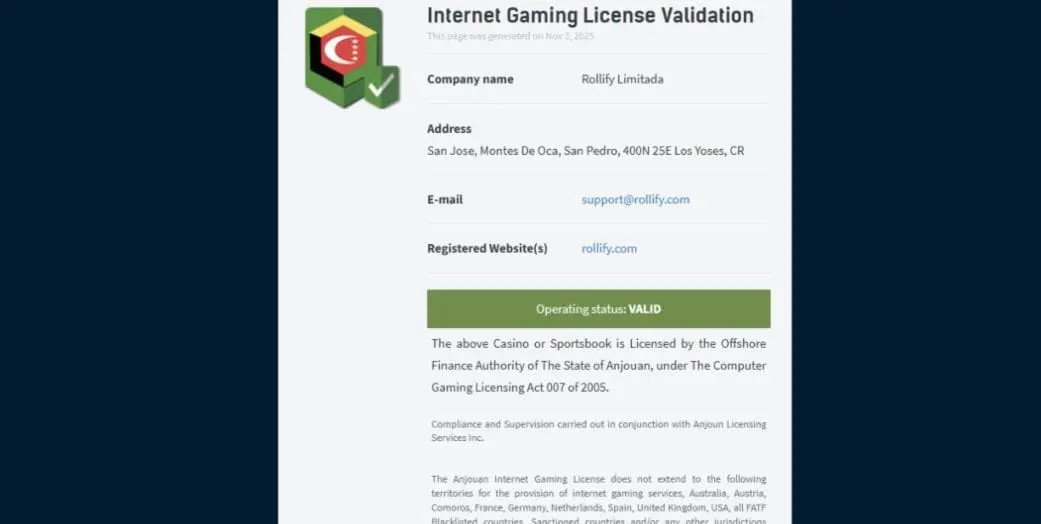 Rollify.com is owned and operated by Rollify Limitada, which is registered in Costa Rica (Reg. No. 3102908645). It is operating under an Anjouan gaming license (ALSI-202408004-FI1).