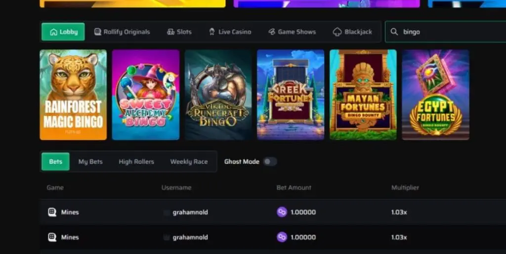 The choice of bingo at Rollify is limited to 6 games, including Rainforest Magic Bingo and Viking Runecraft Bingo from Play’n GO. The only keno game is a Rollbit original.