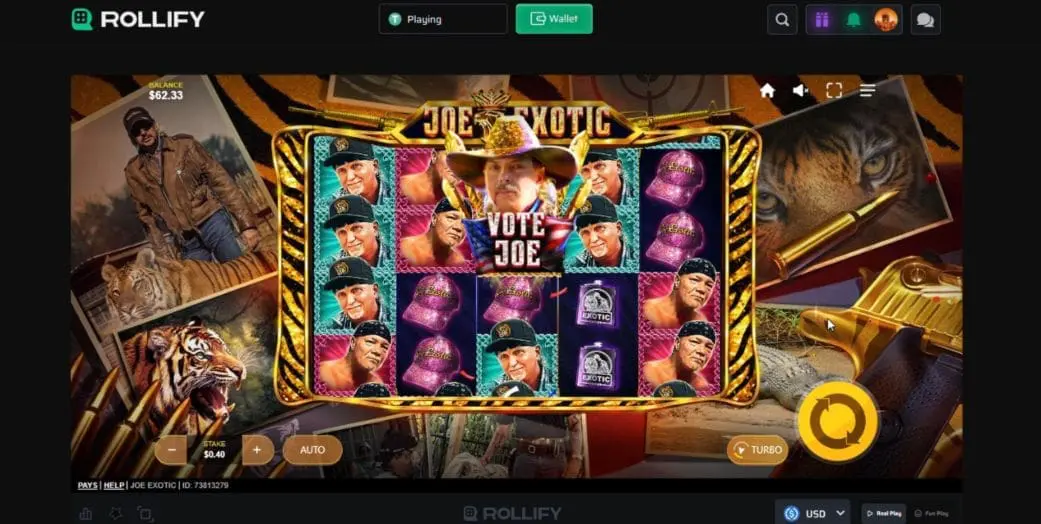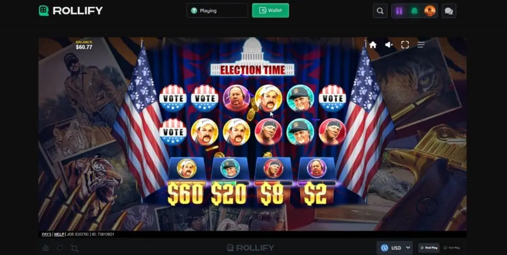 The action is just as intense as the colors in this slot, with special features like the Tiger Bounty, Dynamite, Election Time, and the Exotic Spins. The latter of which features a Super Multiplier Wild that can seriously bump those wins. Specs-wise, Joe Exotic has an official RTP of 97.5%, a medium volatility rating, 20 paylines, 5 reels, and a max win of 4,117x.