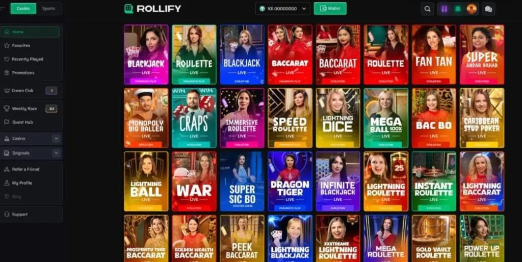 At just over 70 live games, the Rollify live casino is underwhelming. The quality is decent, with all games provided by Evolution and Pragmatic Play, but choice is definitely lacking. Several variants of live blackjack, roulette, and baccarat were available, along with dice games like craps, and live poker.