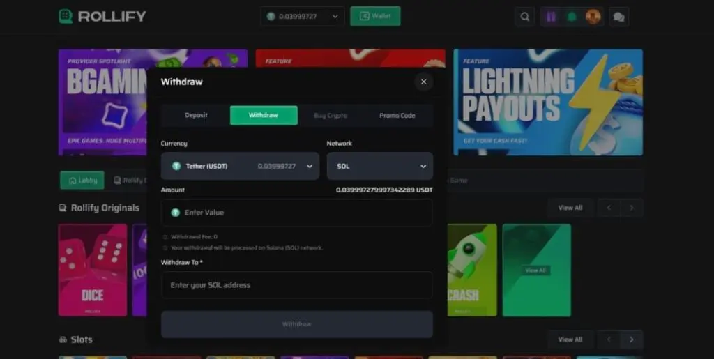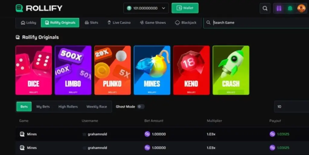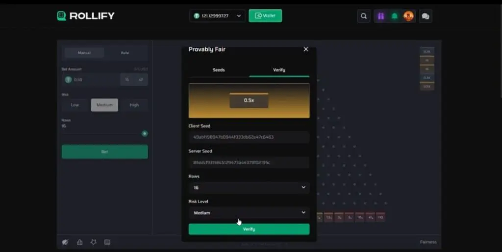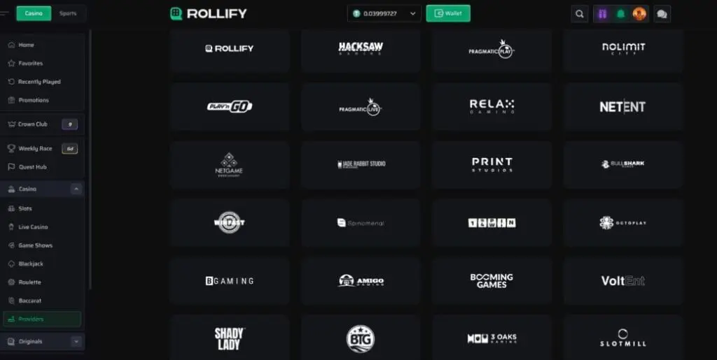 Provably fair game options here are limited to a small range of Rollify originals. Specifically, there’s Dice, Limbo, Plinko, Mines, Keno, and Crash. There were no third-party provably fair games from providers like Spribe, Turbo Games or InOut.